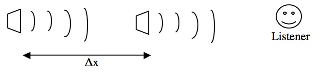 Problem 10: Two identical sound sources (e.g. speakers playing the same music) are separated by a distance of Δx = 2.22 m. See the figure below. Use 345 m/s for the speed of sound in air.
